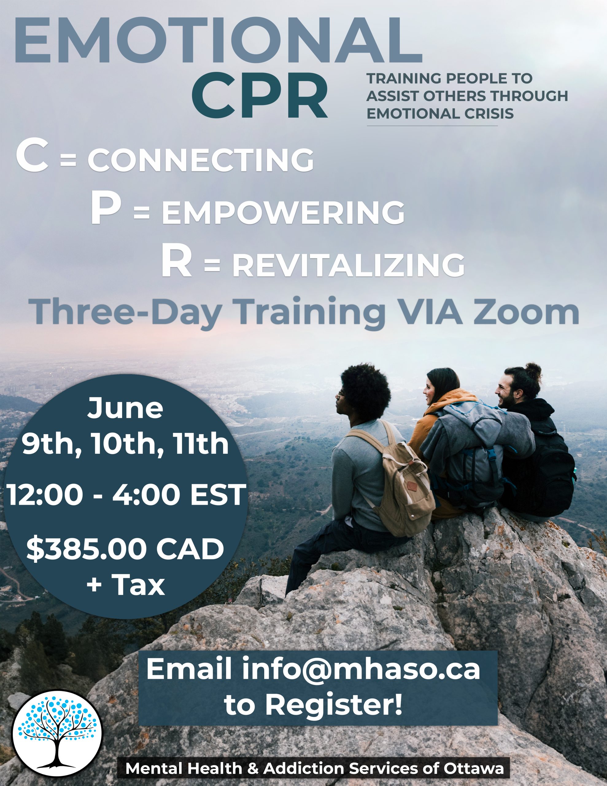 June 9, 10, 11, 2025: 12-Hour Virtual eCPR Certification sponsored by Mental Health & Addiction Services of Ottawa. Click here for the poster